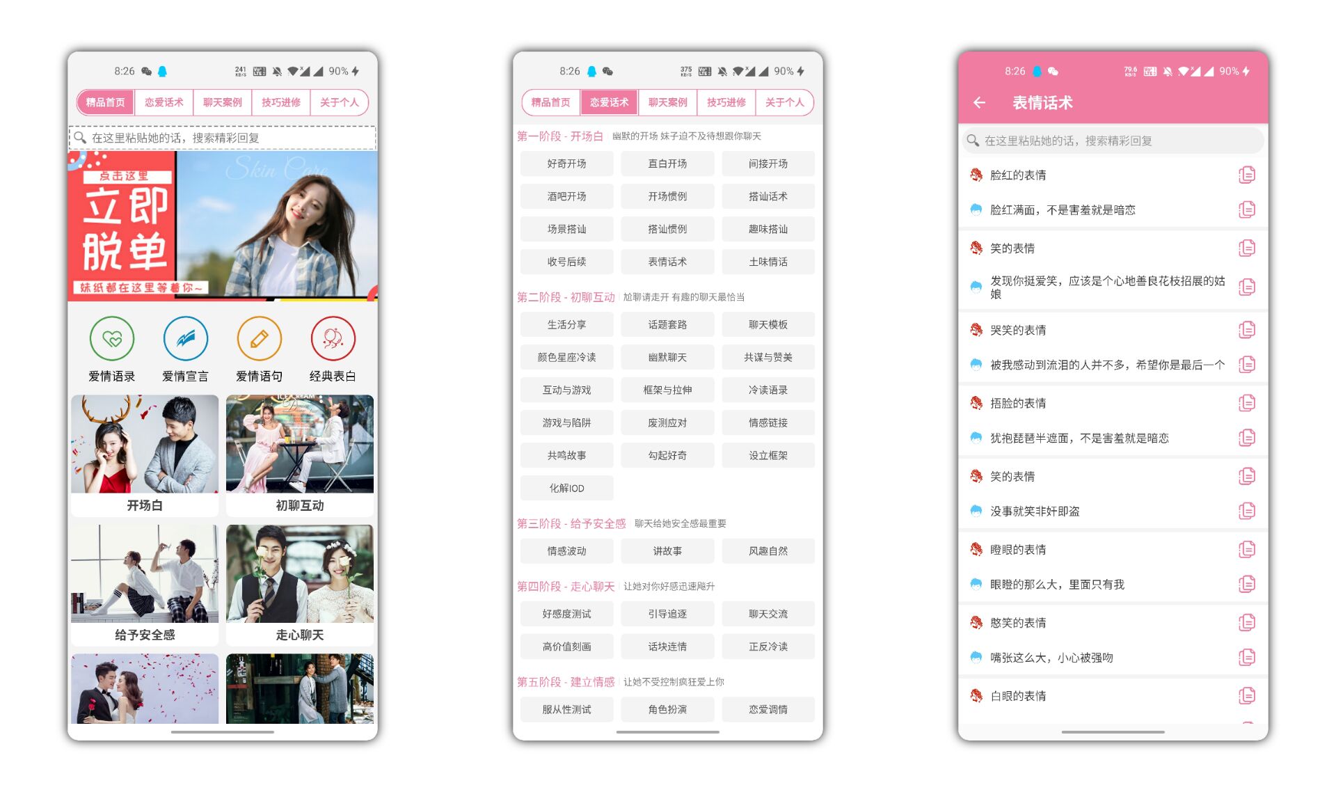 软件介绍:铸就约会恋爱的趣味应用,海量可复制恋爱聊天话术,来练就三寸花式不烂之舌,拒绝出现钢铁尬聊的情况,已修改登录即VIP永久会员