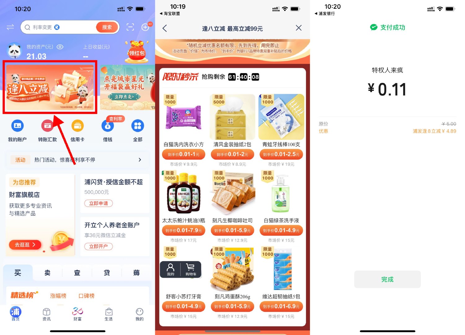 浦发银行APP->横幅活动“逢8立减”->选择自己想要的实物->选择微信,用浦发咔吱付立减4~99元