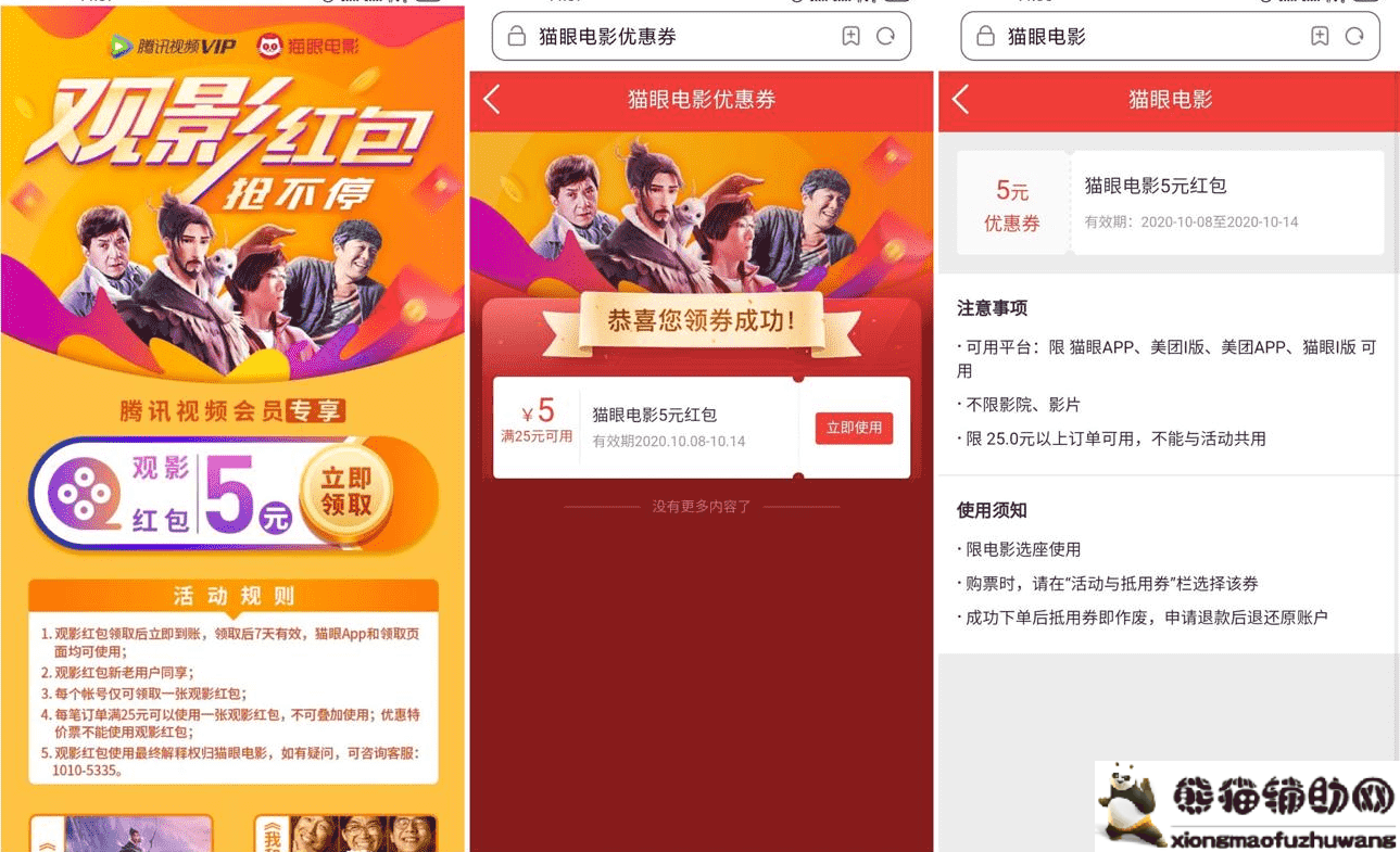 无需腾讯视频会员也可以领取!领取成功后->在猫眼APP、美团APP即可查看使用->有效期7天
