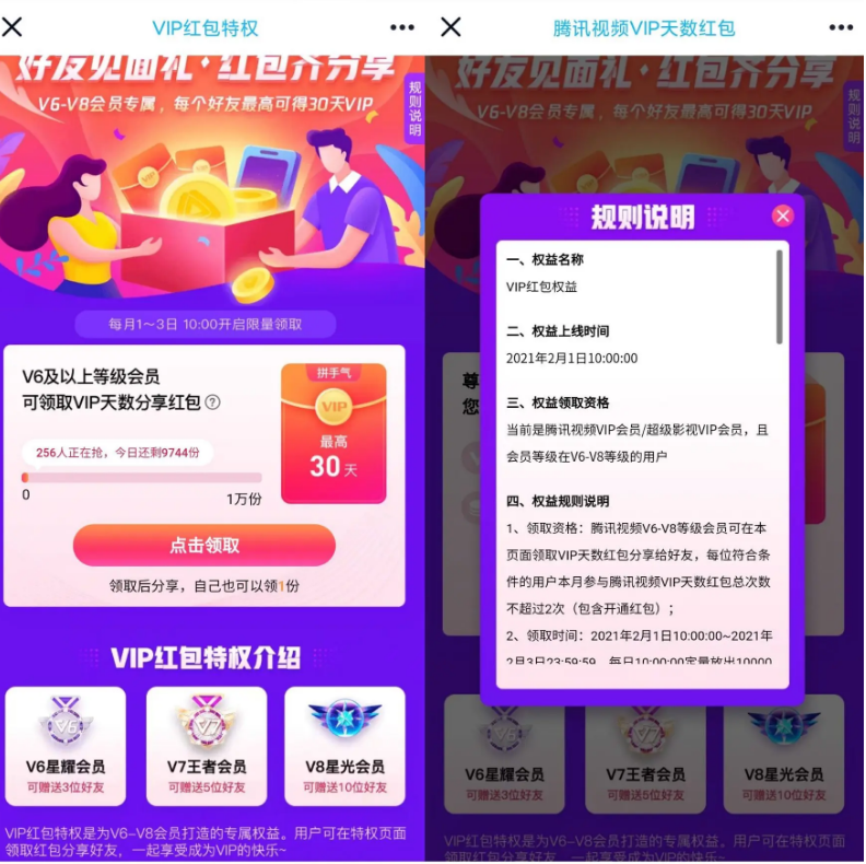 腾讯视频会员V6及以上等级可领分享红包发给任何用户领