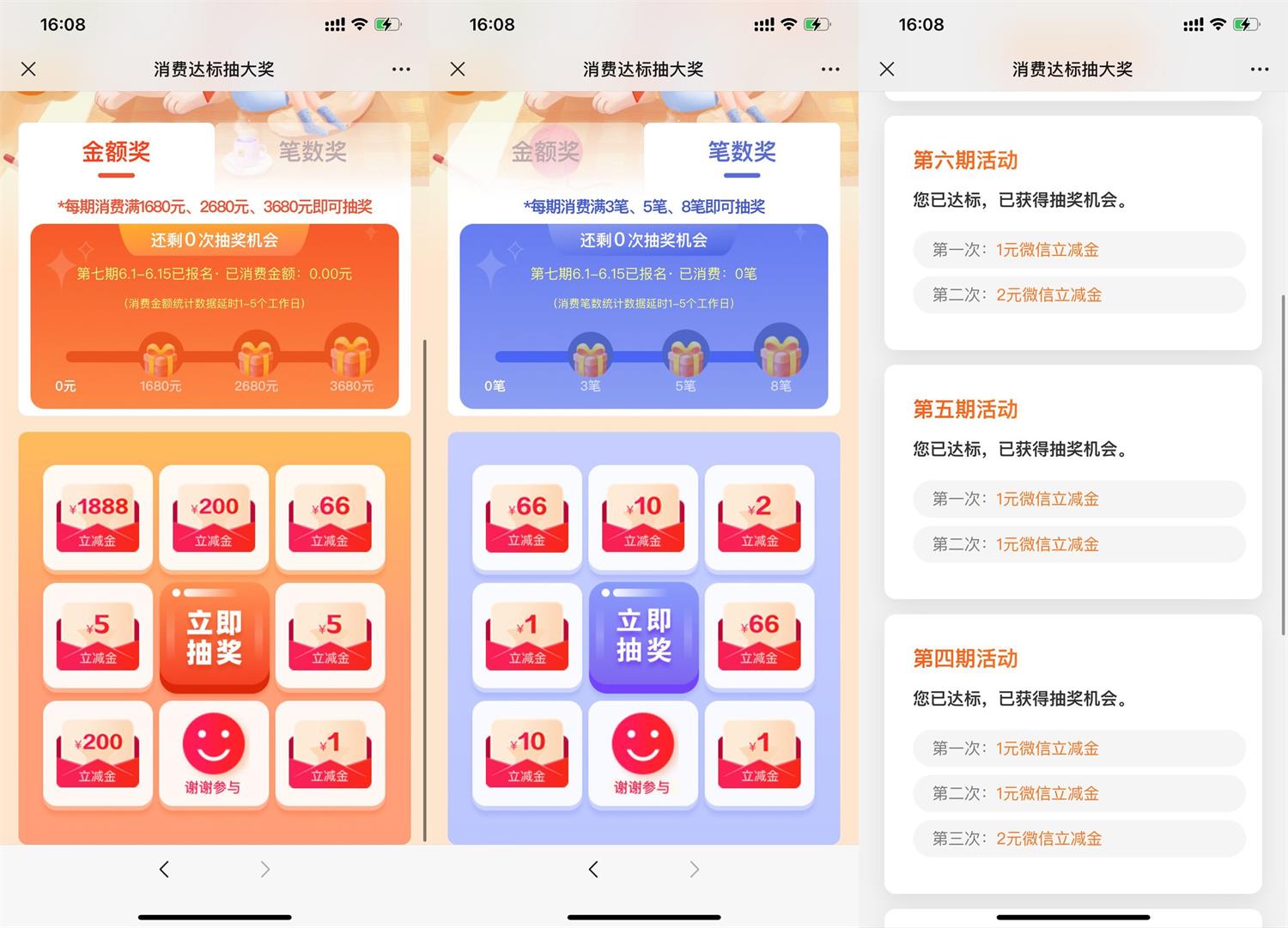 1、微信打开报名后->二选一得抽奖机会->第一种金额奖:达到指定消费金额即可抽